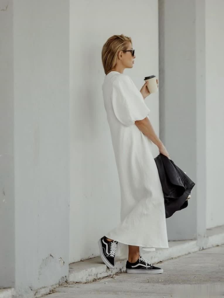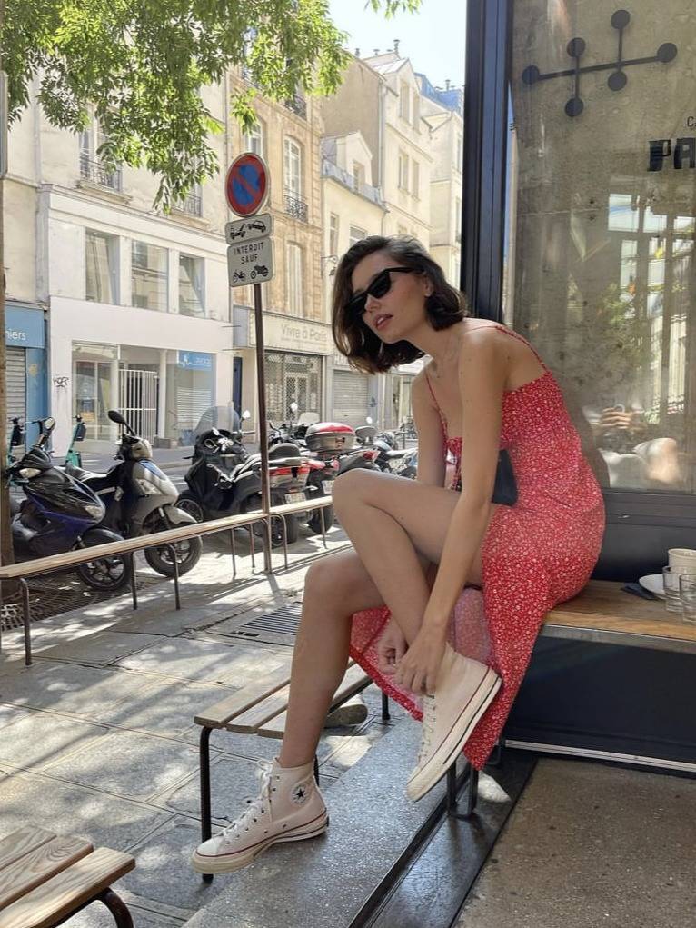慵懒性感的吊带裙搭配休闲舒适的运动鞋,是许多法国女人最爱的look。